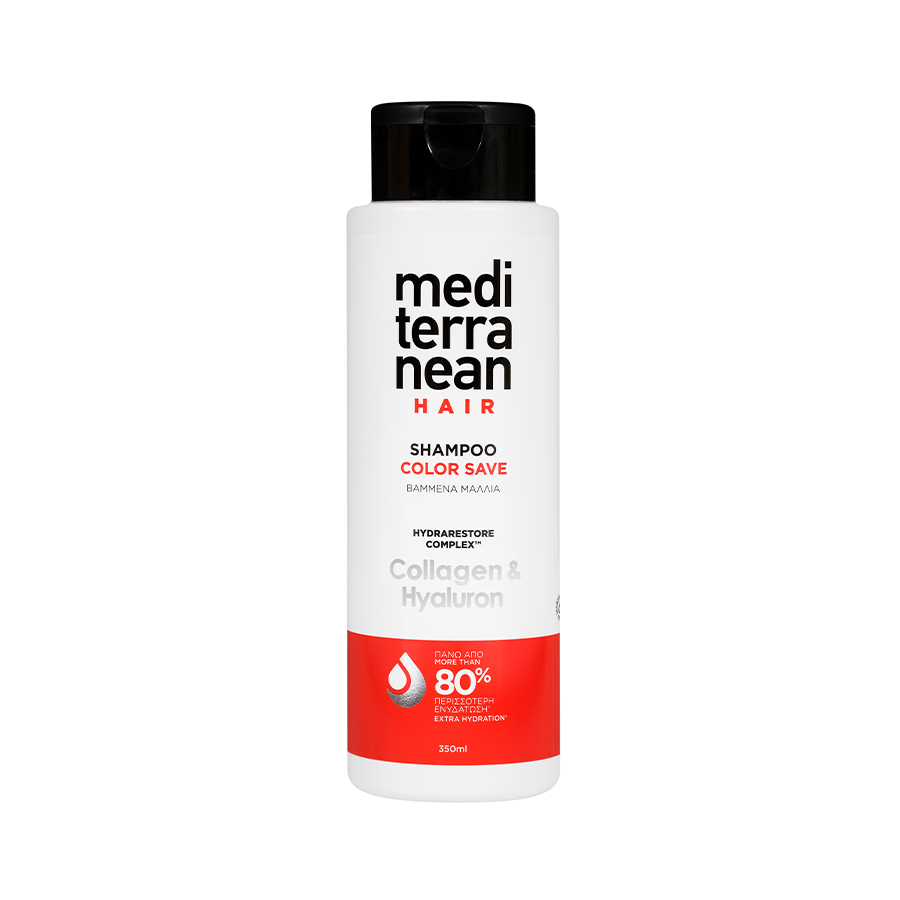 Șampon pentru păr Mediterranean Color Save 350ml. Șampon pentru păr vopsit cu colagen si hyaluron. Oferă 118% extra hidratare. Formula inovatoare cu collagen si hyaluron mentine culoarea părului strălucitoare si luminoasă. Colagenul, proteina cheie a corpului, este responsabil pentru coeziunea si elasticitatea pielii si a părului. Hyaluronul este un ingredient natural al tesutului nostru conjunctiv ce mentine proprietățile hidratante si elastice ale părului.